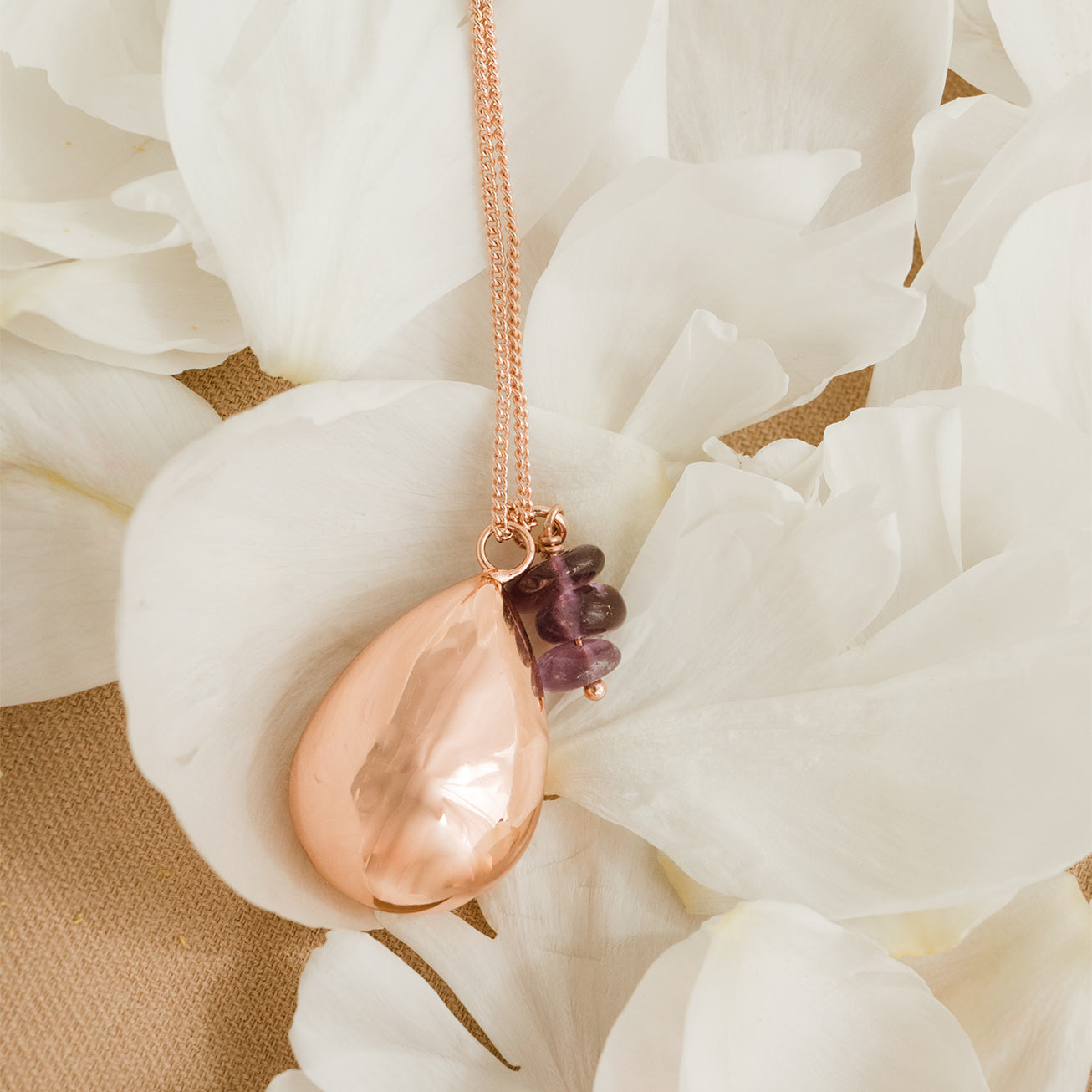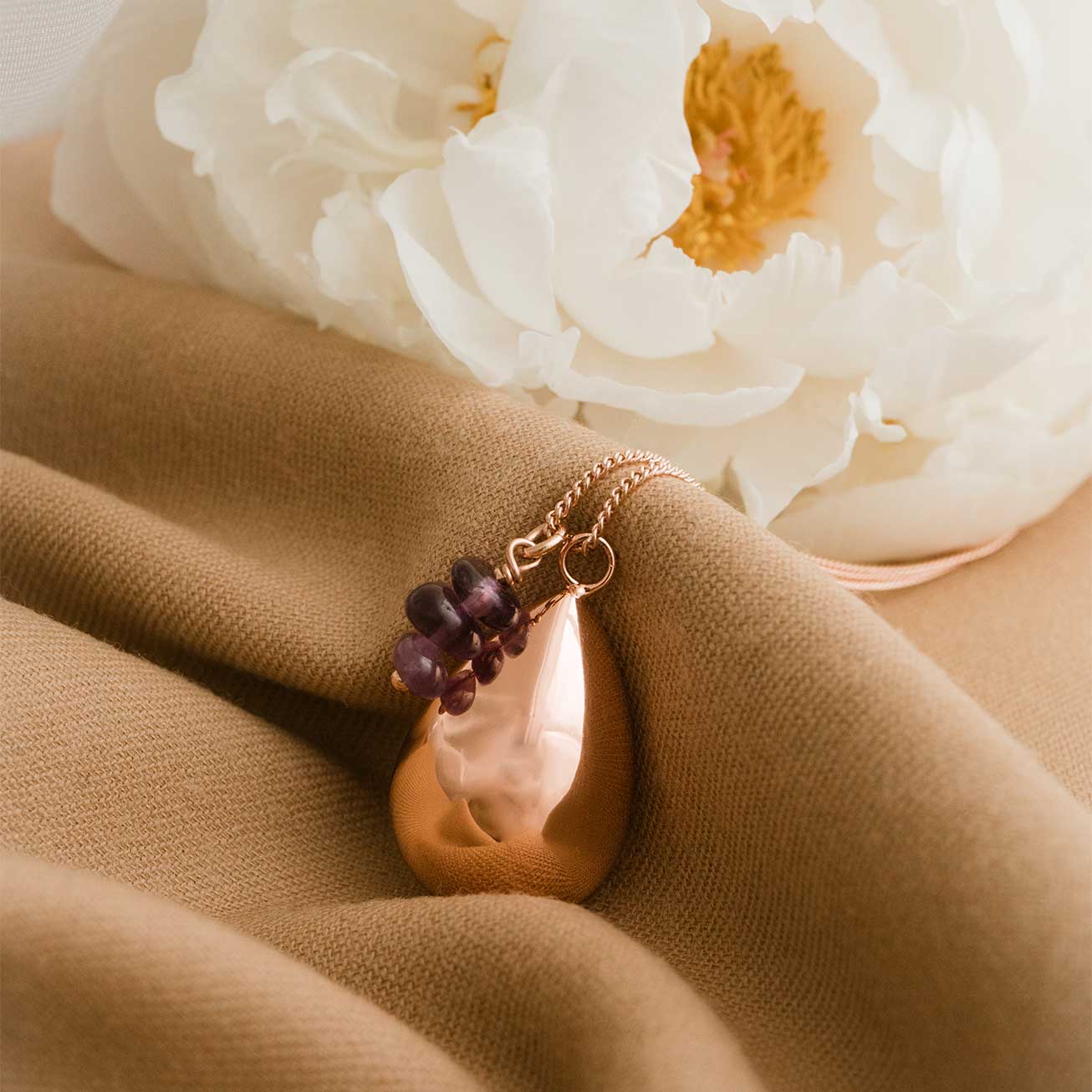 Finement recouvert d'une couche d'or rose, nous avons souhaité accompagner le bola Norah de trois pierres d'améthyste, délicatement roulées pour plus de douceur. Un bijou pour les femmes enceintes qui souhaitent marquer le coup et créer un premier lien avec leur bébé dès la grossesse.