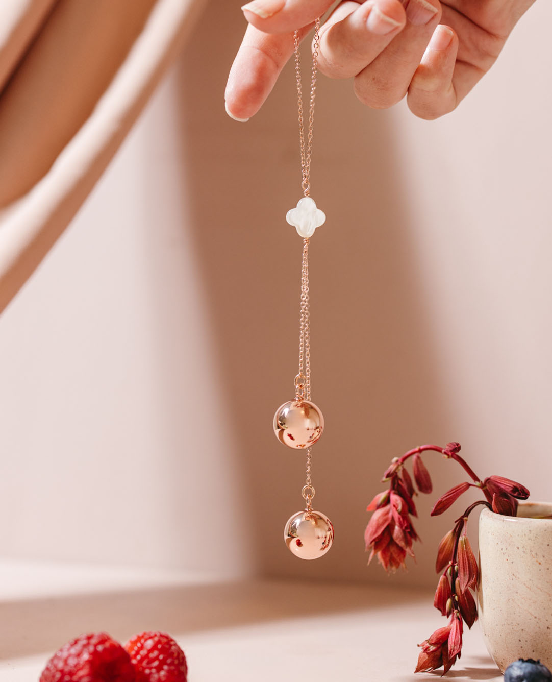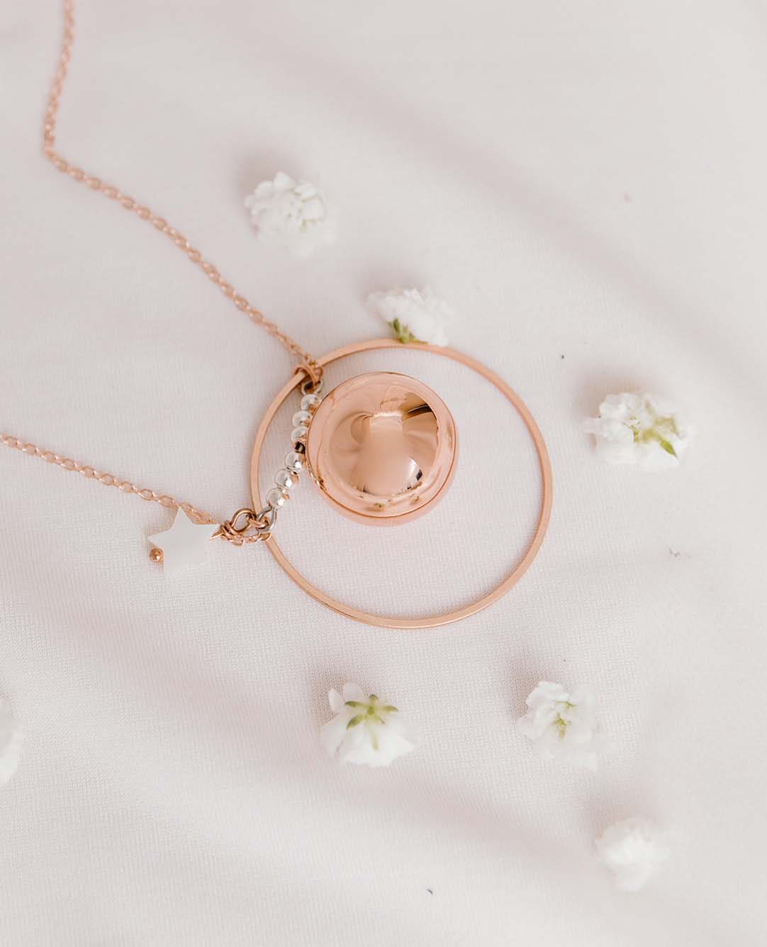 Découvrez ici tous les bolas de grossesse or rose que nous avons dessinés puis imaginés et enfin délicatement montés en France, dans notre atelier. Un large choix de design composent cette collection, nous avons esquissé des bolas or rose avec des pierres semi-précieuses pour les futures mamans qui sont sensibles à la lithothérapie, des colliers de grossesse personnalisés grâce à leurs médailles, ou encore des bijoux de maternité modernes et uniques grâce à leur petite étoile en nacre ou encore leurs jolies perles. Tous les bolas doré à l’or rose sont préparés avec un grand soin par nos bijoutières. Elles sont là pour répondre à la demande de toutes les femmes enceintes sur leur bola de grossesse or rose et satisfaire leurs envies.