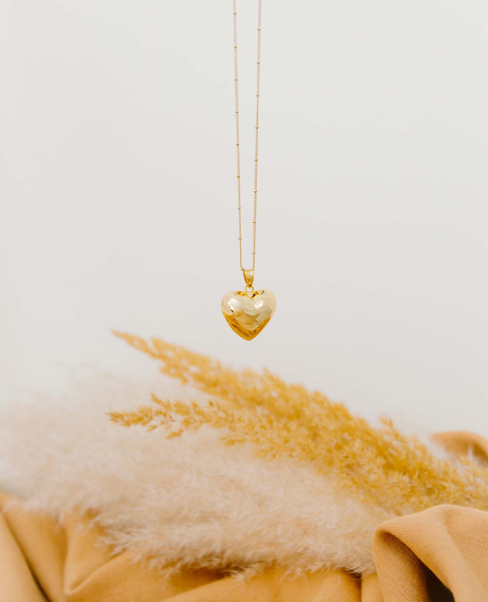 Bola de grossesse en forme de cœur totalement doré accompagné de son collier doré à l'or fin 24 carats. La finesse de la maille satellite apporte une jolie fantaisie au bijou.