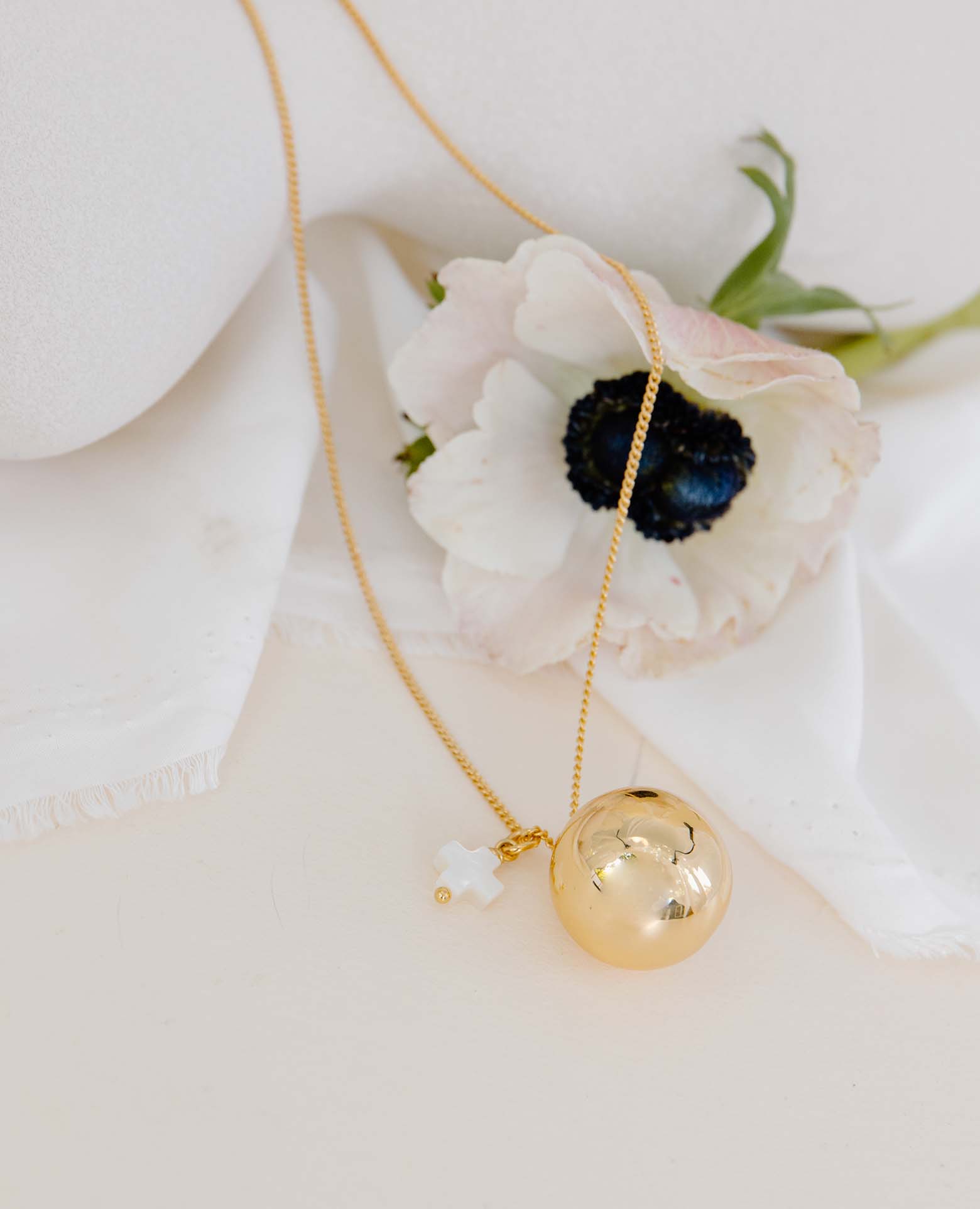 Maëlle est une invitation à cette introspection grâce à sa boule sonore de 20mm et sa douce croix en nacre naturelle. Ses apérités et ses reflets sont ainsi uniques. Ce joli bola de grossesse est suspendue à une chaîne 110 cm dorée à l'or fin 24 carats par notre artisan français. Elle est réglable à 95 cm grâce à son anneau intermédiaire prévu à cet effet. Vous pourrez ainsi porter le bola au niveau de votre ventre et celui-ci suivra sa courbe au fil des mois de grossesse.