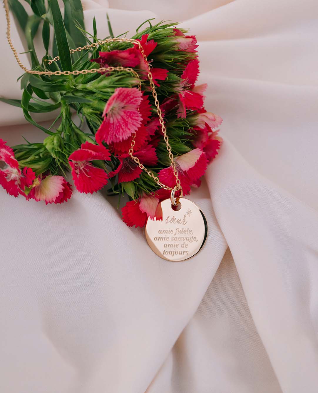 Pour toutes les naissances d'août, nous avons cette idée de cadeau originale et surtout personnalisée. Nous nous occupons de la gravure dans notre atelier drômois afin de trouver le meilleur équilibre. à noter : il s'agit d'un collier 100% plaqué or 18 carats, vous pourrez donc le porter au quotidien sans crainte. Le collier mesure 45 cm et la médaille 20 mm, taille parfaite pour accueillir le prénom de votre choix, celui du bébé par exemple.