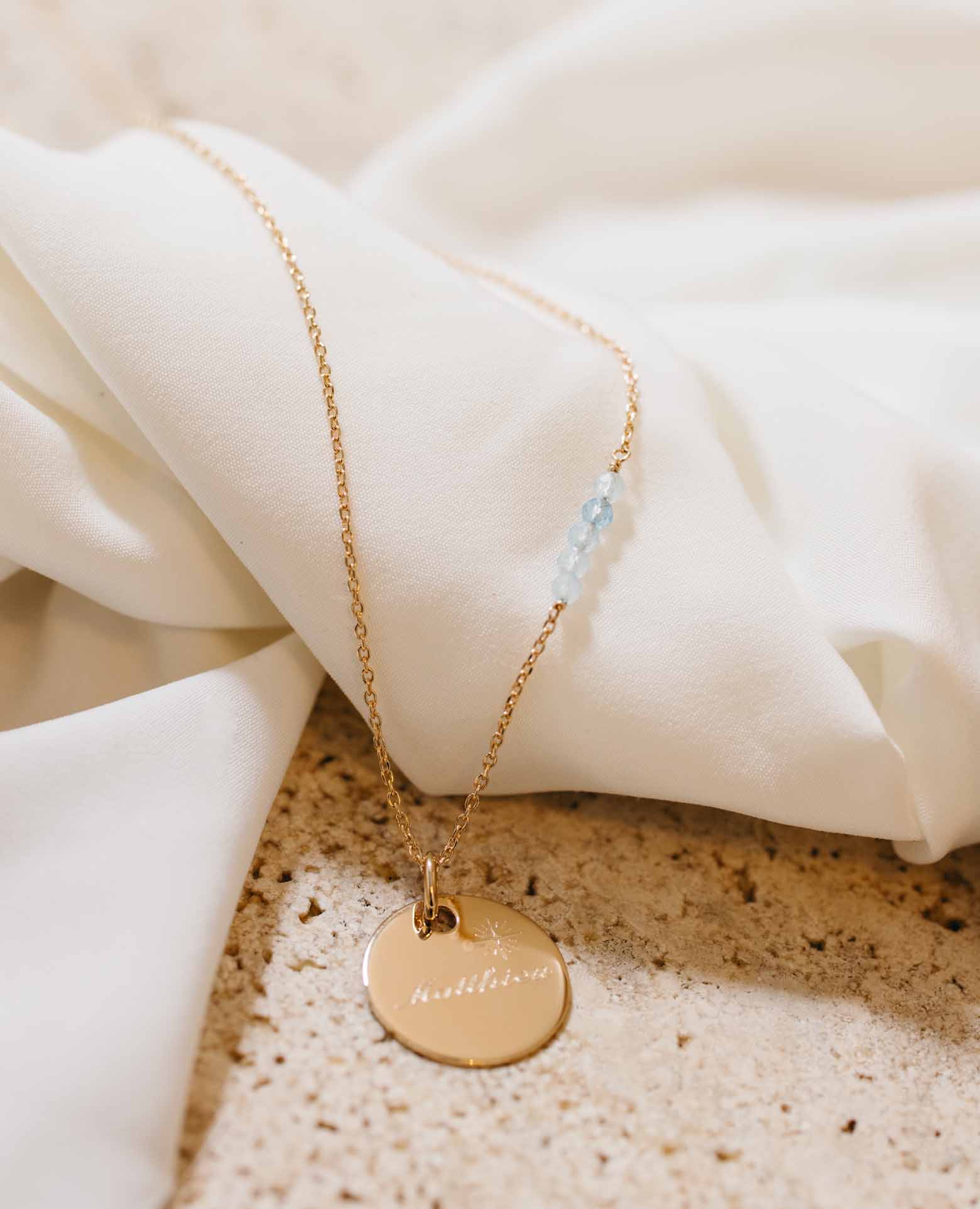 Si vous cherchez un cadeau pour une naissance, ce collier pierre de naissance est idéal et surtout unique. Nous avons imaginé cette collection afin d'avoir la possibilité de graver cette jolie médaille et surtout d'arborer la pierre de naissance du mois de Mars, l'Aigue Marine, souvent associée aux personnes du signe du zodiaque Poisson ou Bélier.