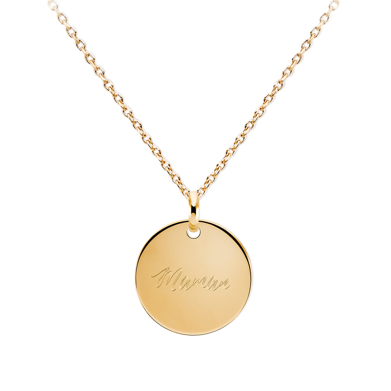 Cette médaille bombée en plaqué or est suspendue à sa jolie chaîne de 45 cm, arrivant au niveau de la poitrine.